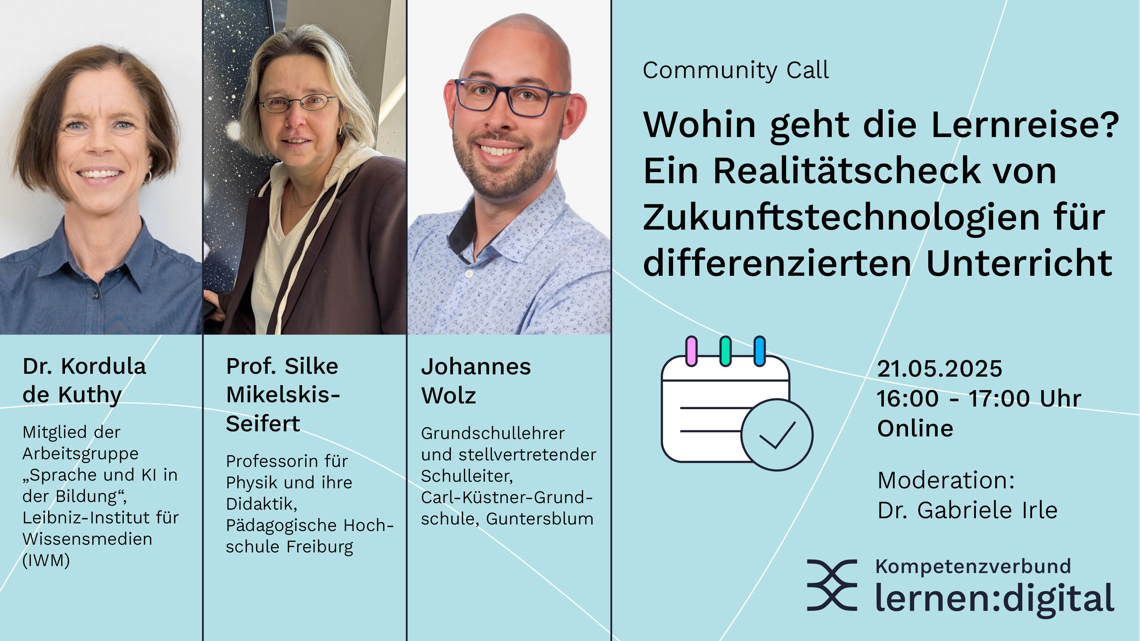 Im Gespräch zwischen Kordula De Kuthy (Wissenschaftliche Mitarbeiterin in der Arbeitsgruppe „Sprache und KI in der Bildung“, Leibniz-Institut für Wissensmedien (IWM)), Silke Mikelskis-Seifert (Professur für Physik und ihre Didaktik, Pädagogische Hochschule Freiburg, beteiligt am lernen:digital am Projekt MINT-ProNeD) und Johannes Wolz (Grundschullehrer und stellvertretender Schulleiter, Carl-Küster-Grundschule, Guntersblum, Betreiber des Blogs Milos Welt) das von Gabriele Irle (Wissenschaftliche Mitarbeiterin am Leibniz-Institut für Wissensmedien (IWM) und Redakteurin im lernen:digital Zukunftsraum) moderiert wurde, können Sie diese und weitere Themen rund im Zukunftstechnologien für differenzierten Unterricht vertiefen. Organisiert wurde der Community Call von den Redaktionsteams vom lernen:digital Zukunftsraum und schule-mal-digital.de.